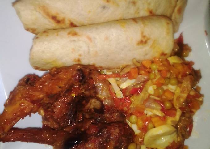 Steps to Prepare Perfect Flat bread, fried chicken with side vegetable sauce